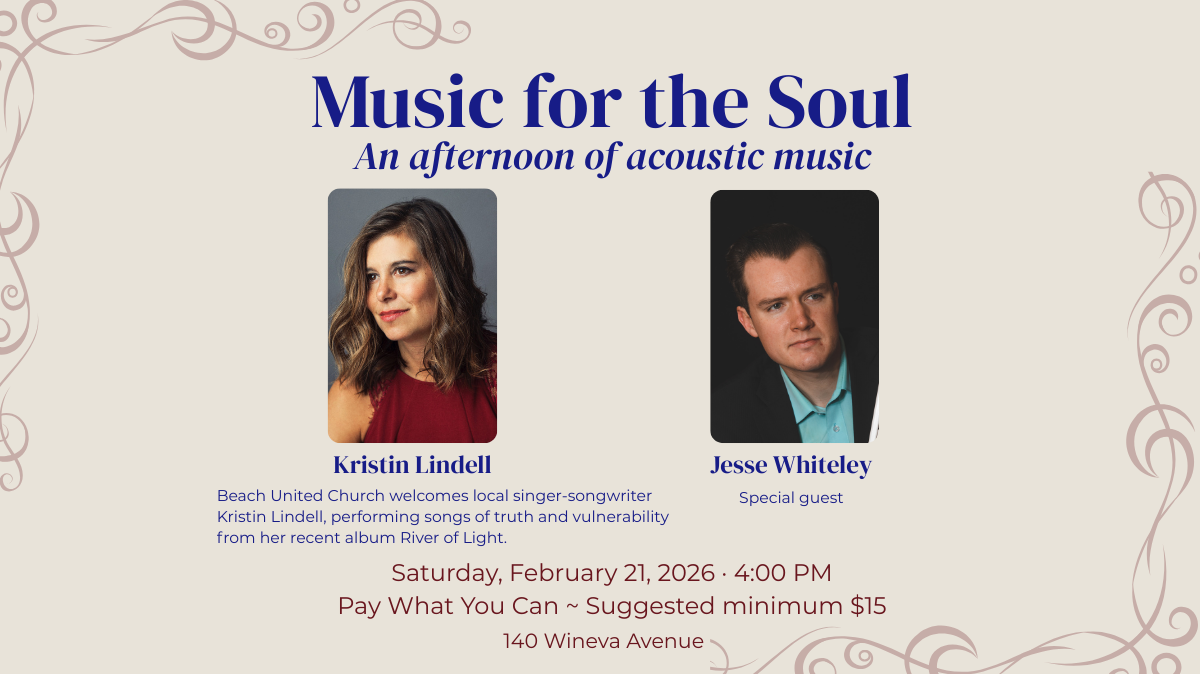 Music for the Soul – February 21. Beach United Church welcomes local singer-songwriter Kristin Lindell for an intimate afternoon concert.…